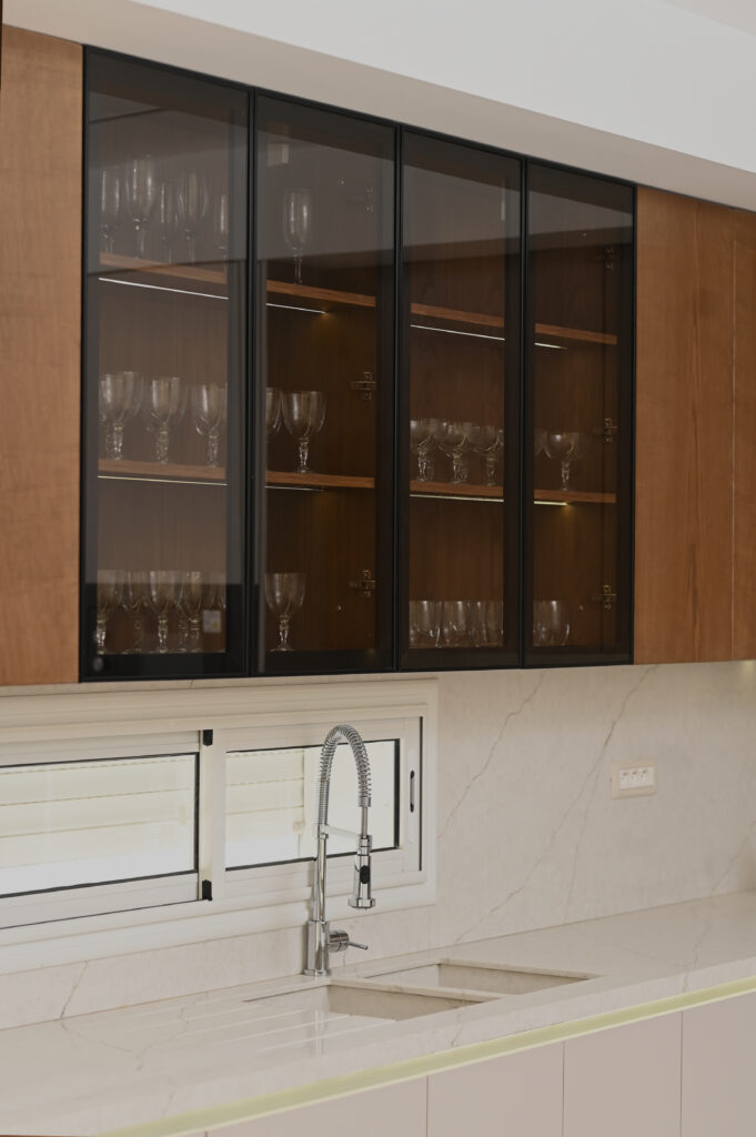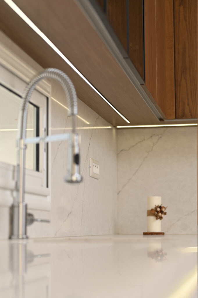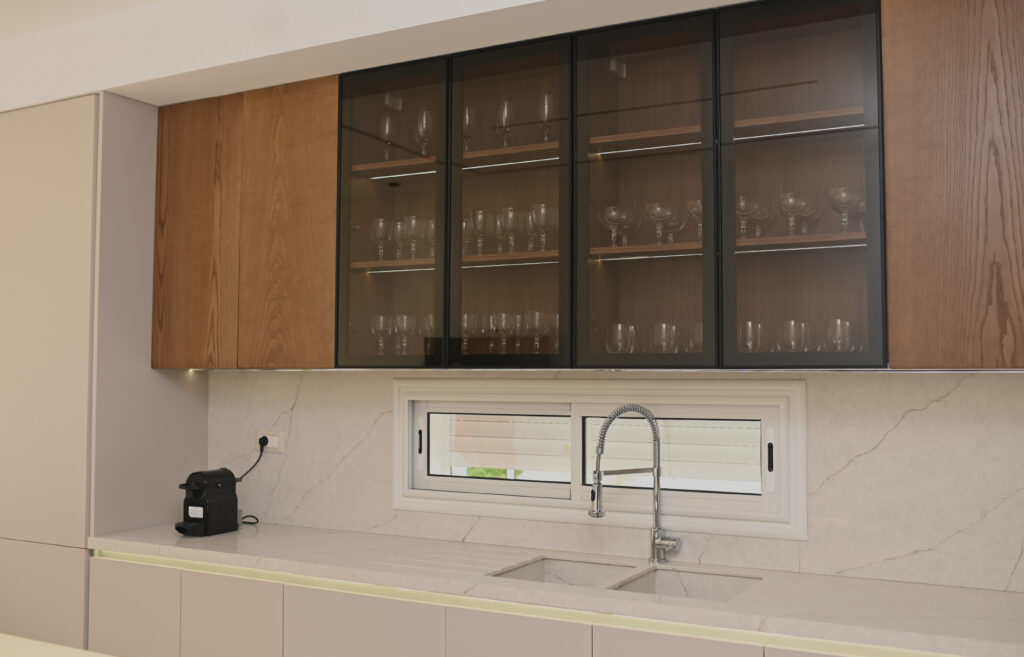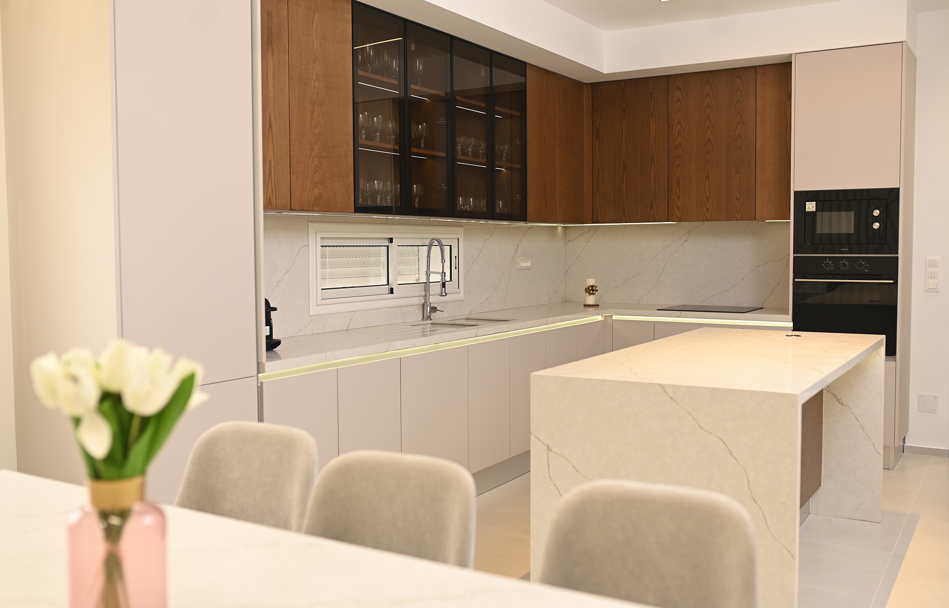 Plan de travail et crédence en quartz, avec des éléments vitrés effet miroir
