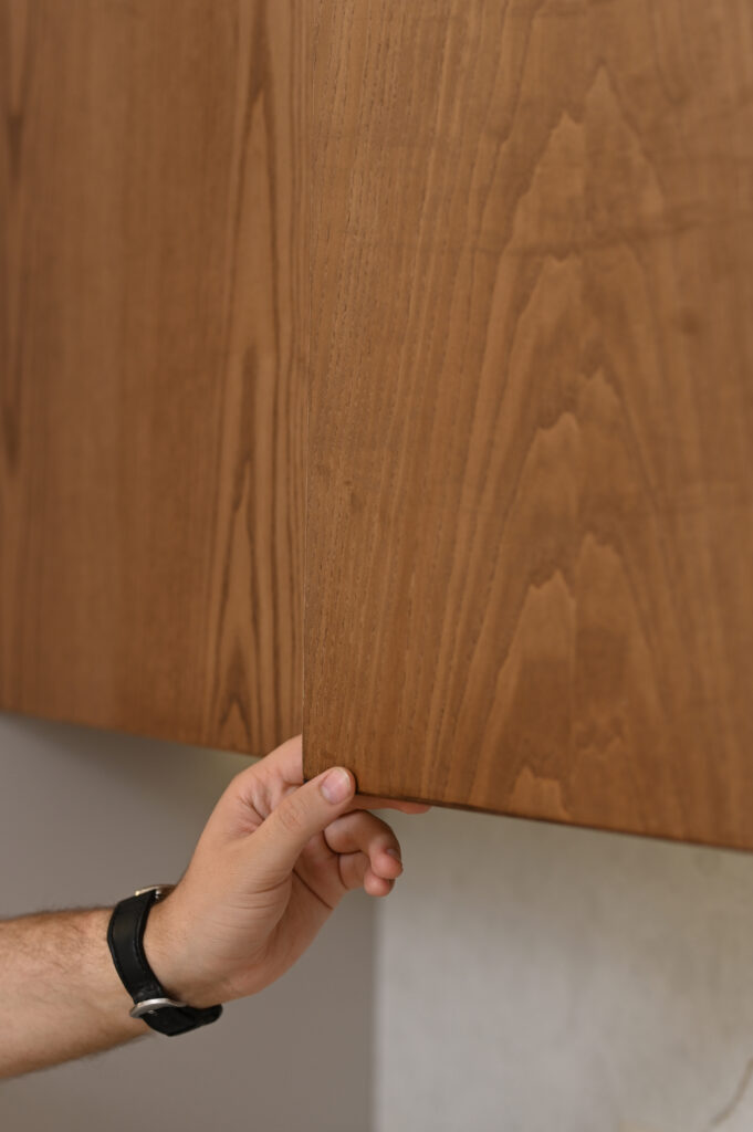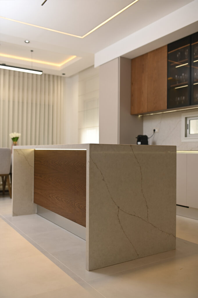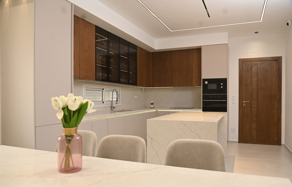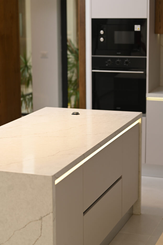 Cette cuisine moderne en blanc se distingue par son élégance et sa fonctionnalité. L’îlot central en grès blanc, avec sa forme unique et sculpturale, ajoute une dimension esthétique remarquable tout en offrant une valeur pratique à l’espace. Le plan de travail et la crédence en quartz confèrent un aspect raffiné et durable, idéal pour un usage quotidien. Les éléments vitrés avec effet miroir rehaussent la luminosité et donnent une impression de profondeur, créant un espace à la fois sophistiqué et accueillant.