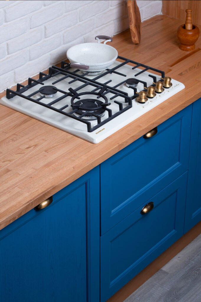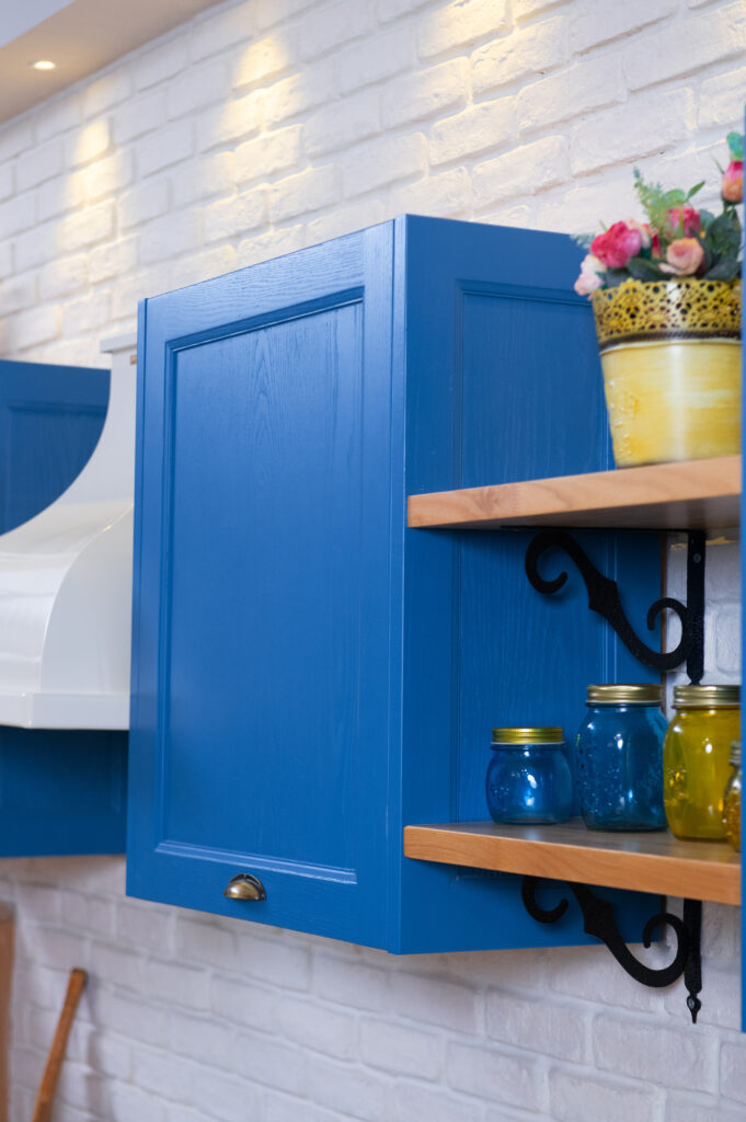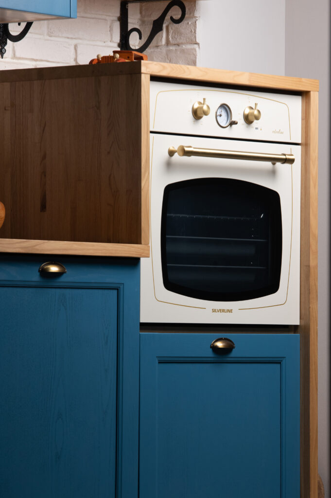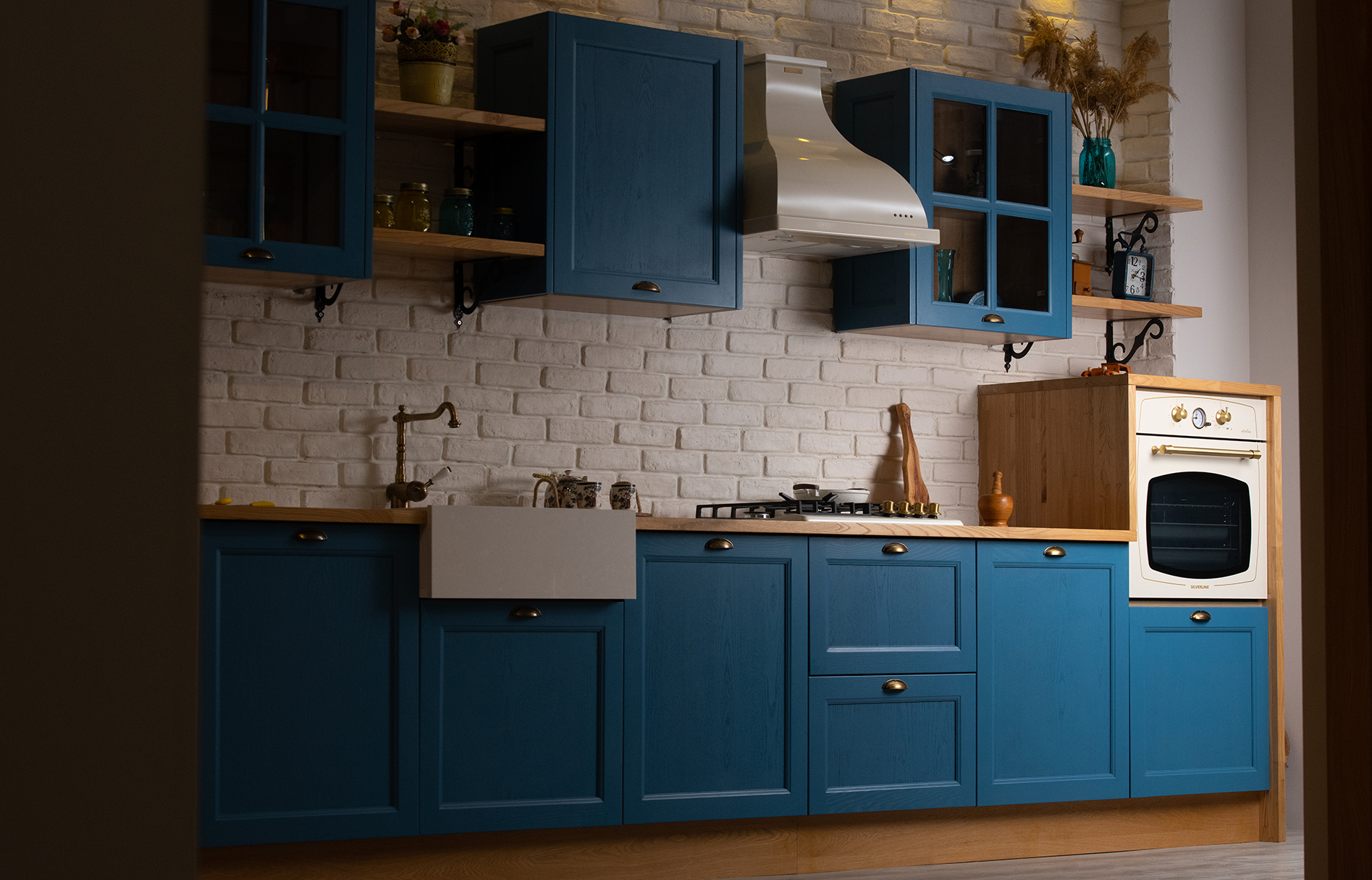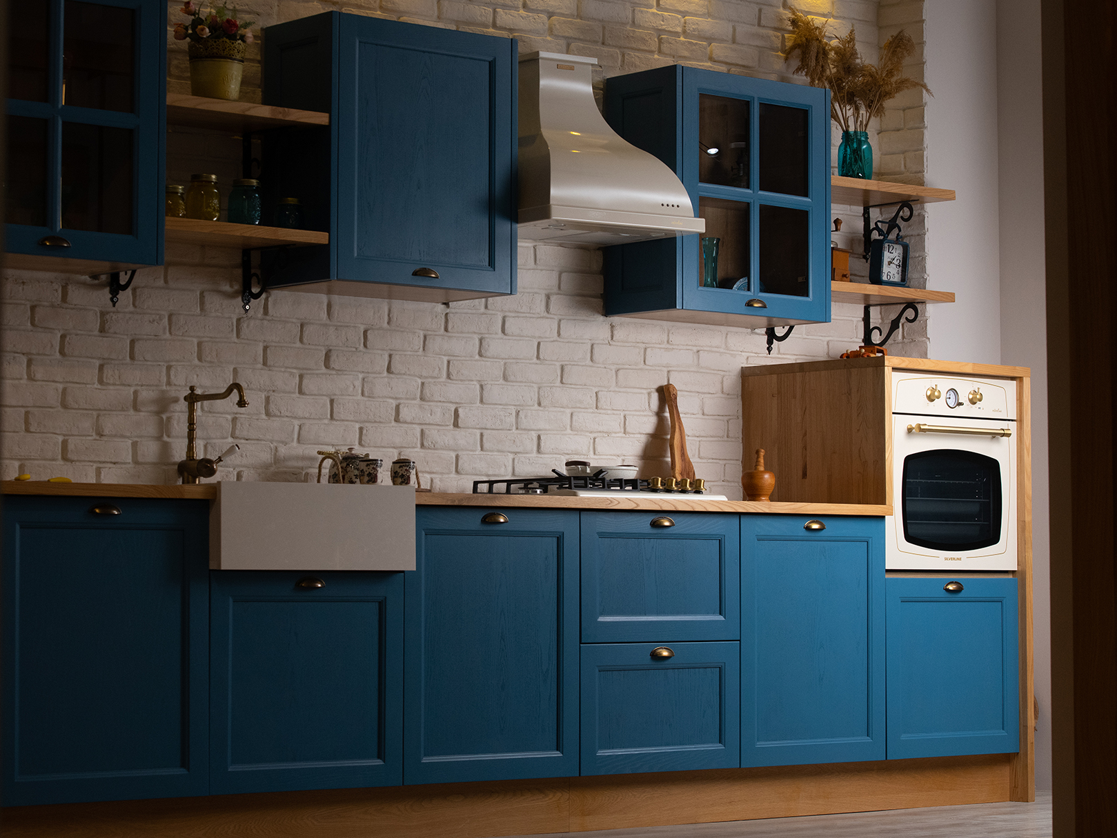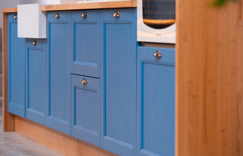Cuisine vintage en bois bleu, avec des armoires et éléments de rangement en bois de haute qualité. Les tons bleus doux et le grain naturel du bois offrent une esthétique intemporelle et sophistiquée, alliant charme vintage et fonctionnalité moderne pour une cuisine véritablement unique💙.