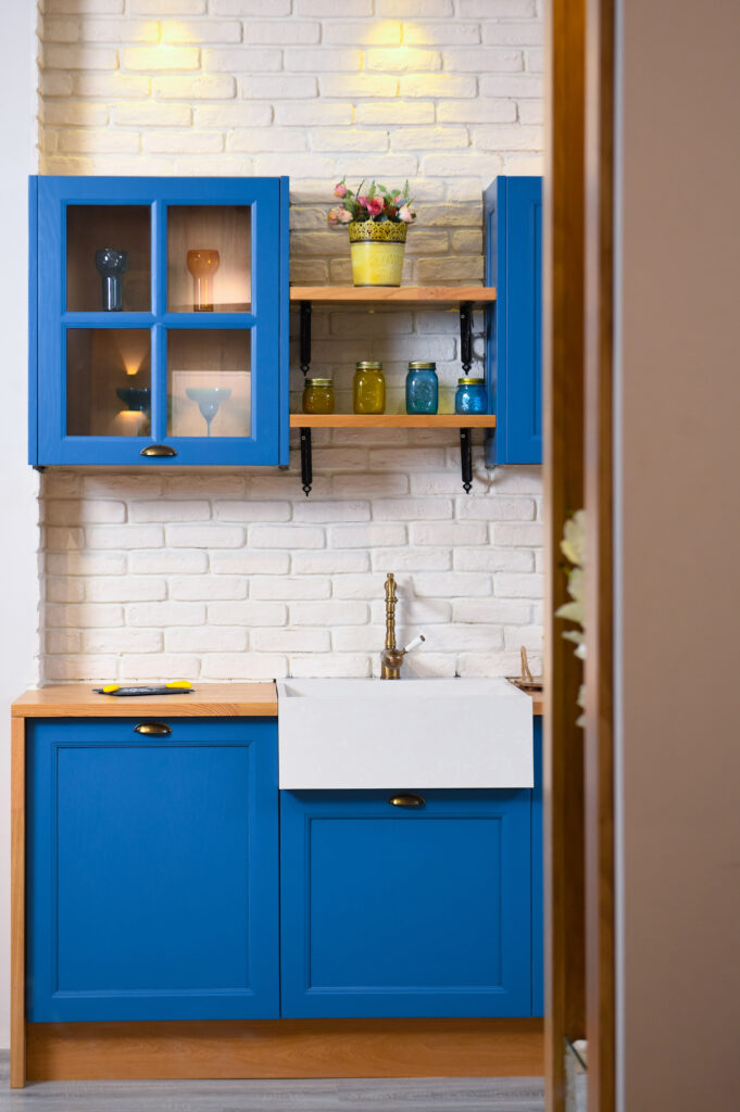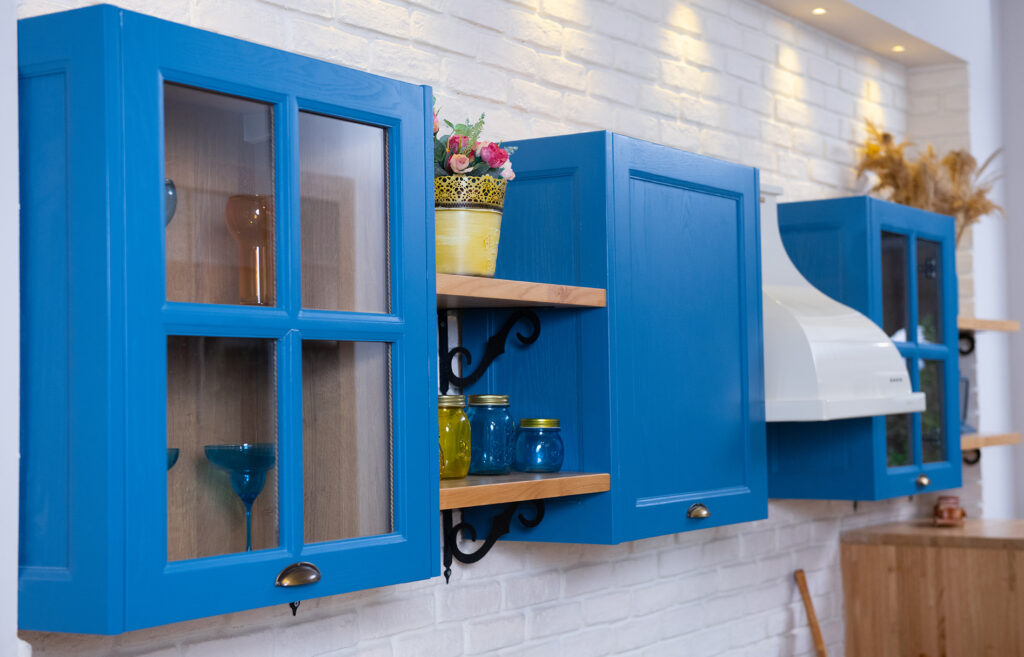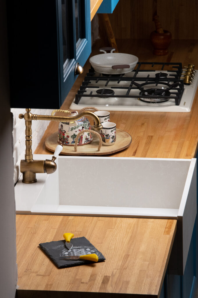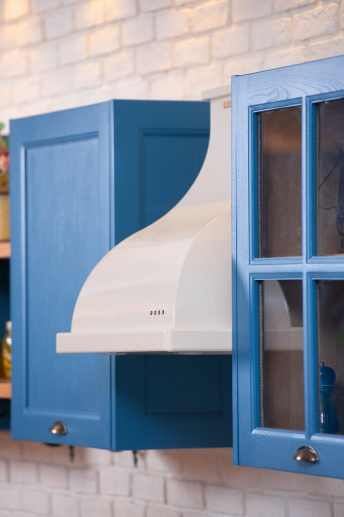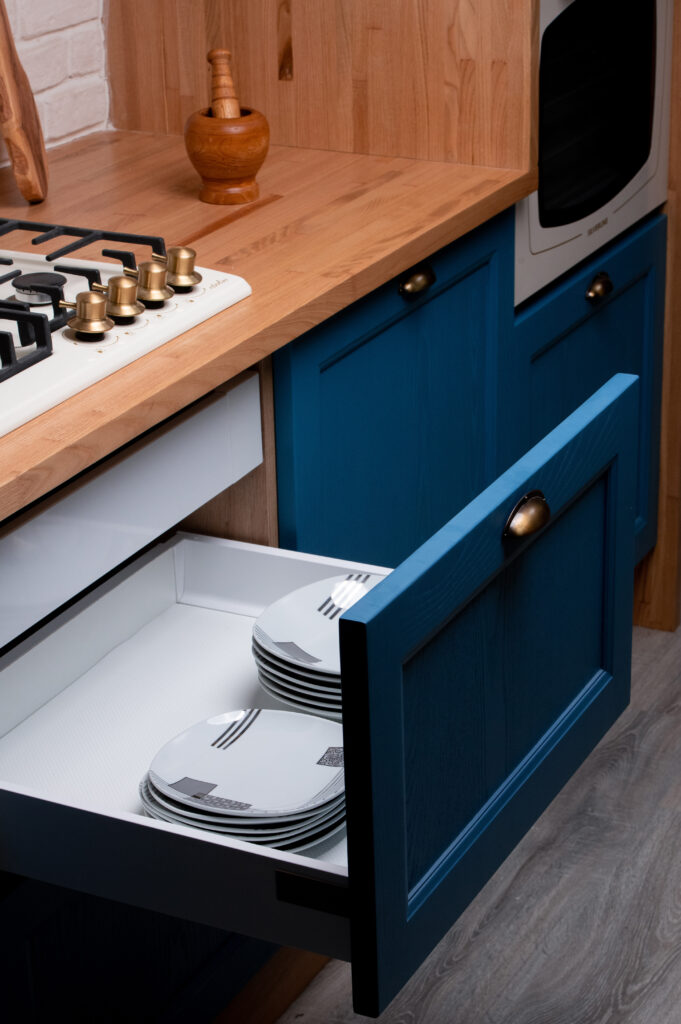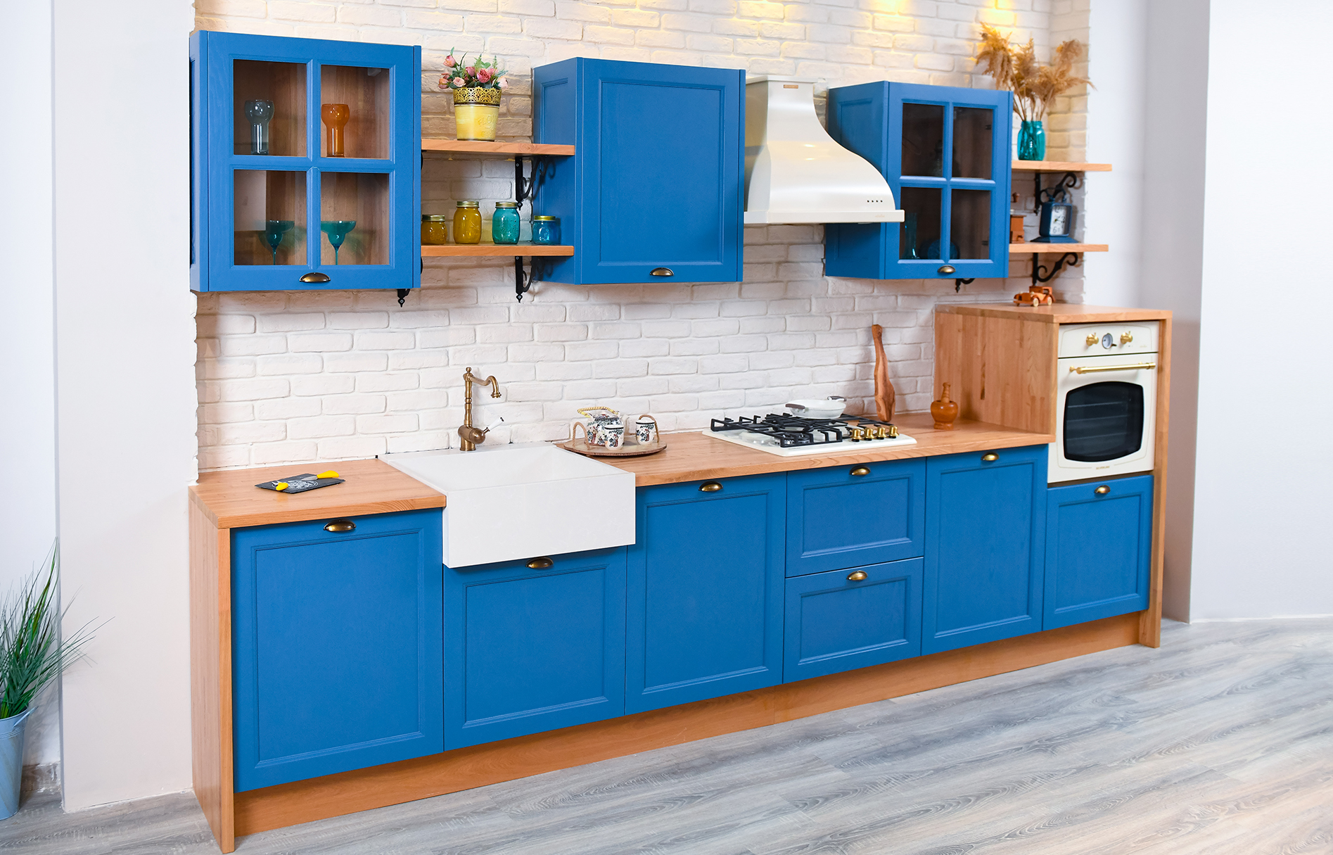 Cuisine vintage en bois bleu, avec des armoires et éléments de rangement en bois de haute qualité. Les tons bleus doux et le grain naturel du bois offrent une esthétique intemporelle et sophistiquée, alliant charme vintage et fonctionnalité moderne pour une cuisine véritablement unique💙.